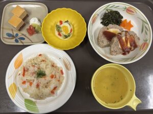 【軟菜食 1 】 ・ピラフ ・スコッチエッグ ・ポテトツリー ・コンソメスープ ・キャラメルケーキ