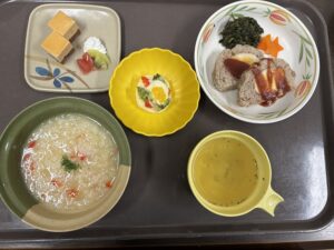 【軟菜食 2 】 ・リゾット風 ・スコッチエッグ ・ポテトツリー ・コンソメスープ ・キャラメルケーキ