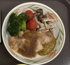 今回のメインはローストチキンです!今年はアクセントにマスタードソースを添えています。 柔らかくジューシーで、ボリューム満点に仕上がりました。