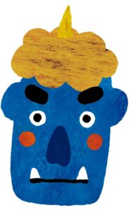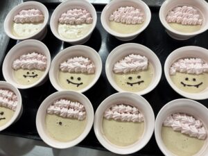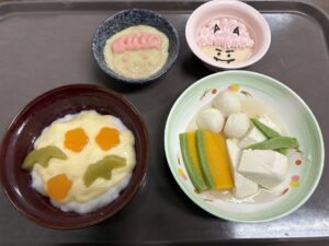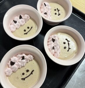 軟菜やミキサー食のデザートの落花生プリンにはクリームやチョコペンで可愛らしい鬼を描かせていただきました。