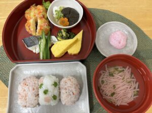 春野菜の筍の煮物や、熊本県民定番のサラダちくわ、春らしい色味の混ぜご飯にデザートの桜餅まで、
