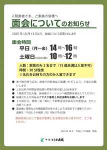【入院患者さま】面会についてのお知らせ(2025年10月変更)