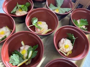変わり稲荷には紫蘇とエビを乗せ、わさびマヨネーズで仕上げています。